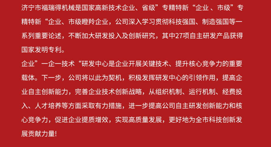 濟(jì)寧市福瑞得機(jī)械有限公司是一家集科研、�產(chǎn)及�N(xiāo)售為一�w的綜合性企業(yè)。專(zhuān)業(yè)從事各�(lèi)機(jī)械�O(shè)備的研發(fā)與�產(chǎn)。