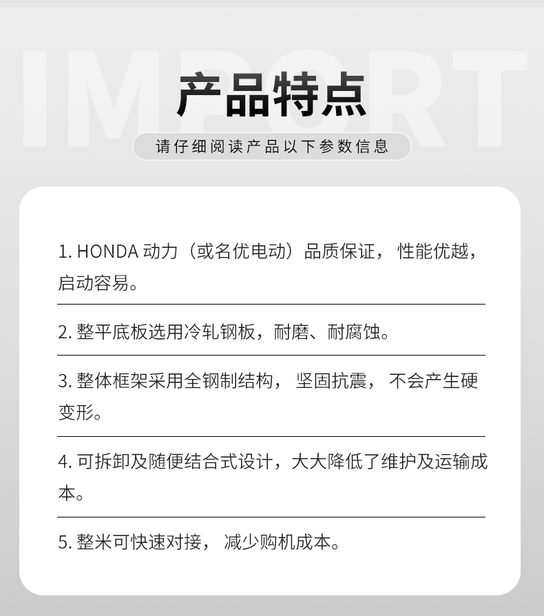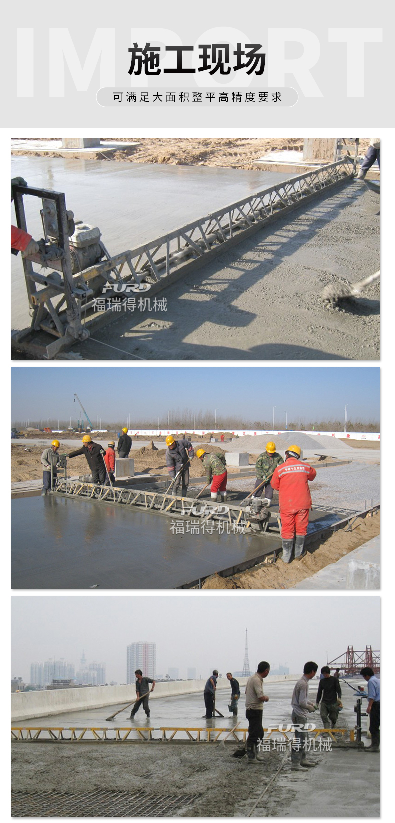 用于混凝土地面的提�{、壓實、整平、是修建公路、��g、廣場、現(xiàn)代化廠房的新型�O(shè)備。是傳統(tǒng)攤�機(jī)的�級換代產(chǎn)品,汽油機(jī)動力及�動機(jī)可任意�x擇。