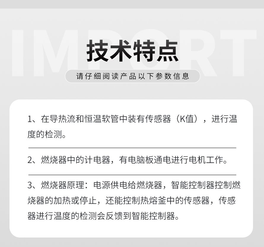 燃燒器原理:�源供�給燃燒器,智能控制器控制燃燒器的加熱或停止,�能控制熱熔釜中的傳感器,傳感器�M(jìn)行溫度的檢測(cè)會(huì)反�到智能控制器。