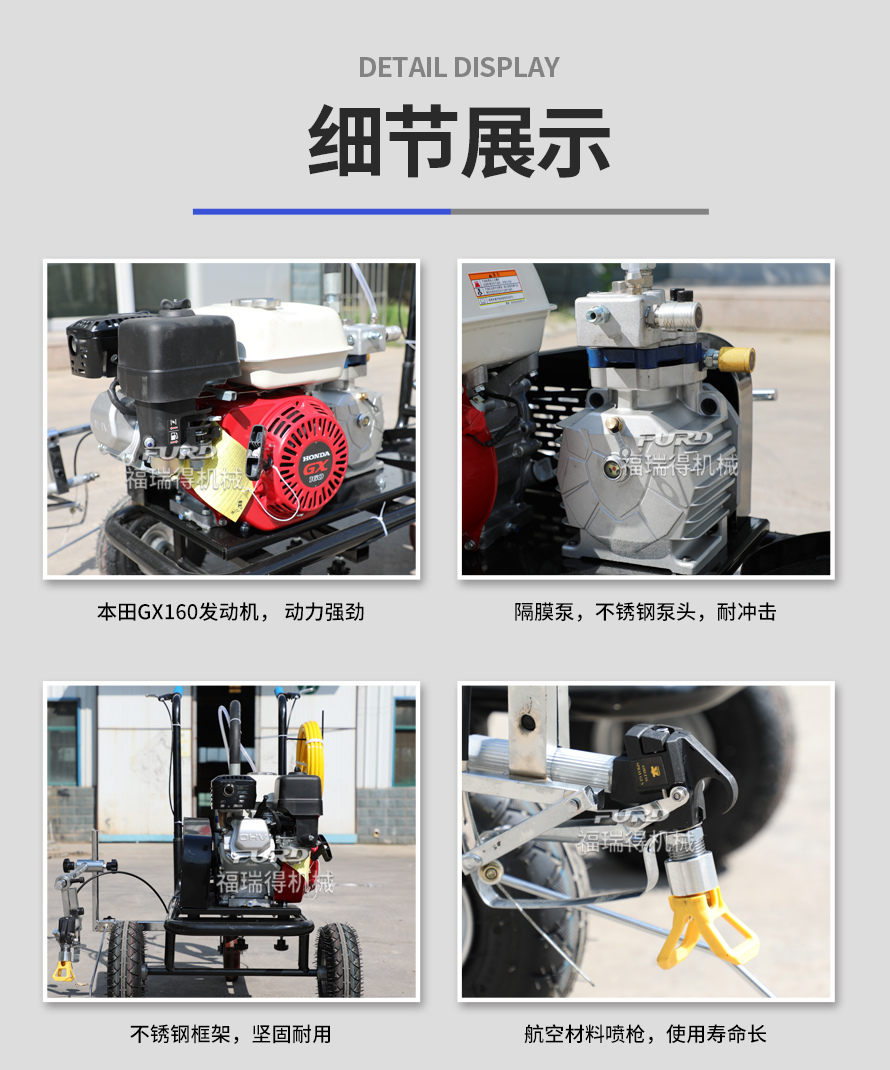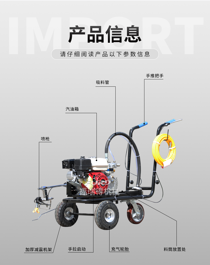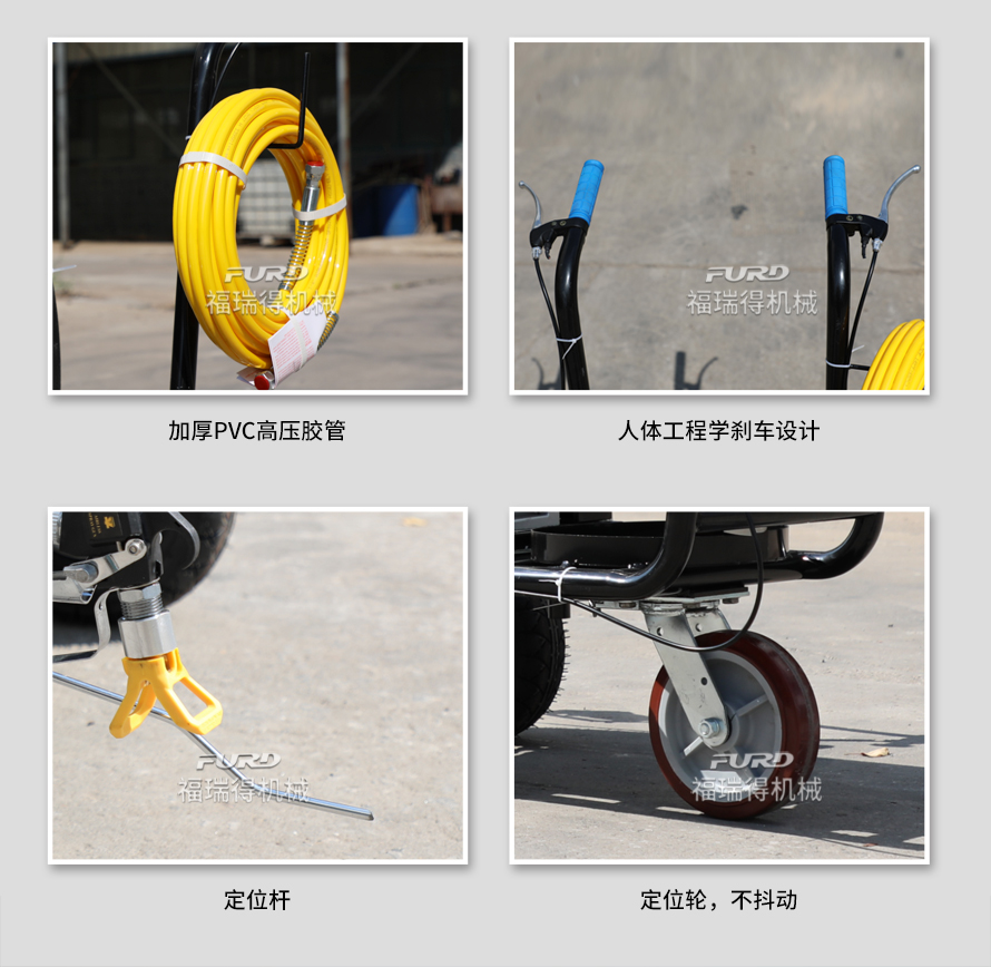 小型手推式道路劃線機是一種在道路、停車場、廣場和跑道等平整地面上劃出不同約束、指引和警示等規(guī)則限制標志的路面施工機械。最常見的就是在馬路上劃斑馬線,在路上劃車庫線、停車線等等應(yīng)用于小型工程、短途施工,活動方便,靈活操作。