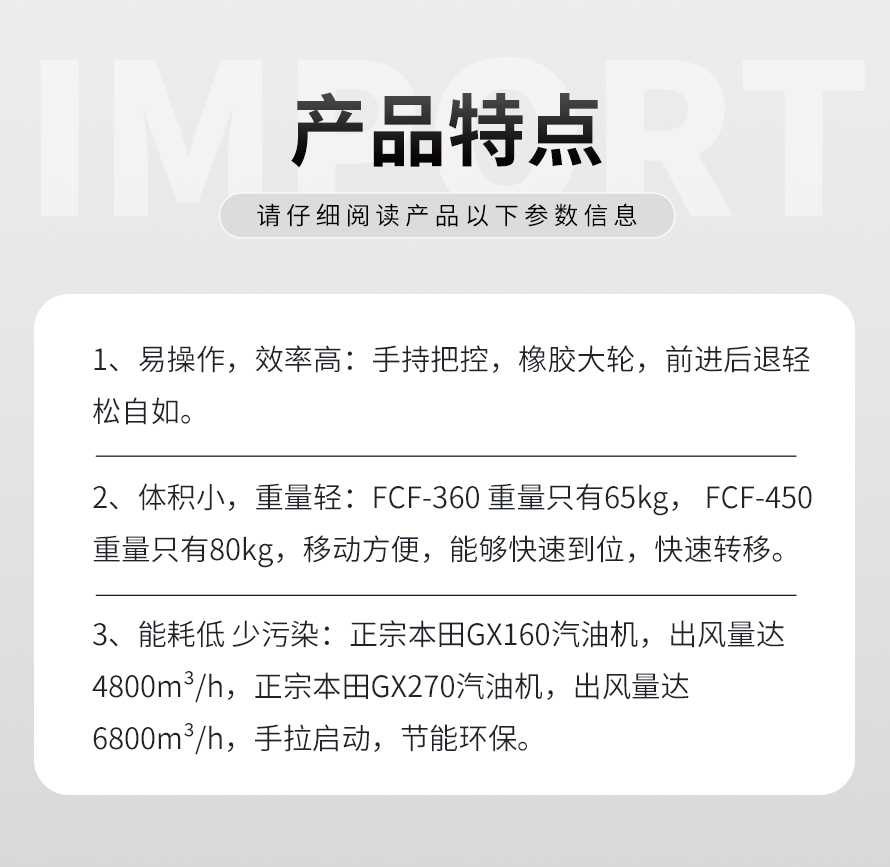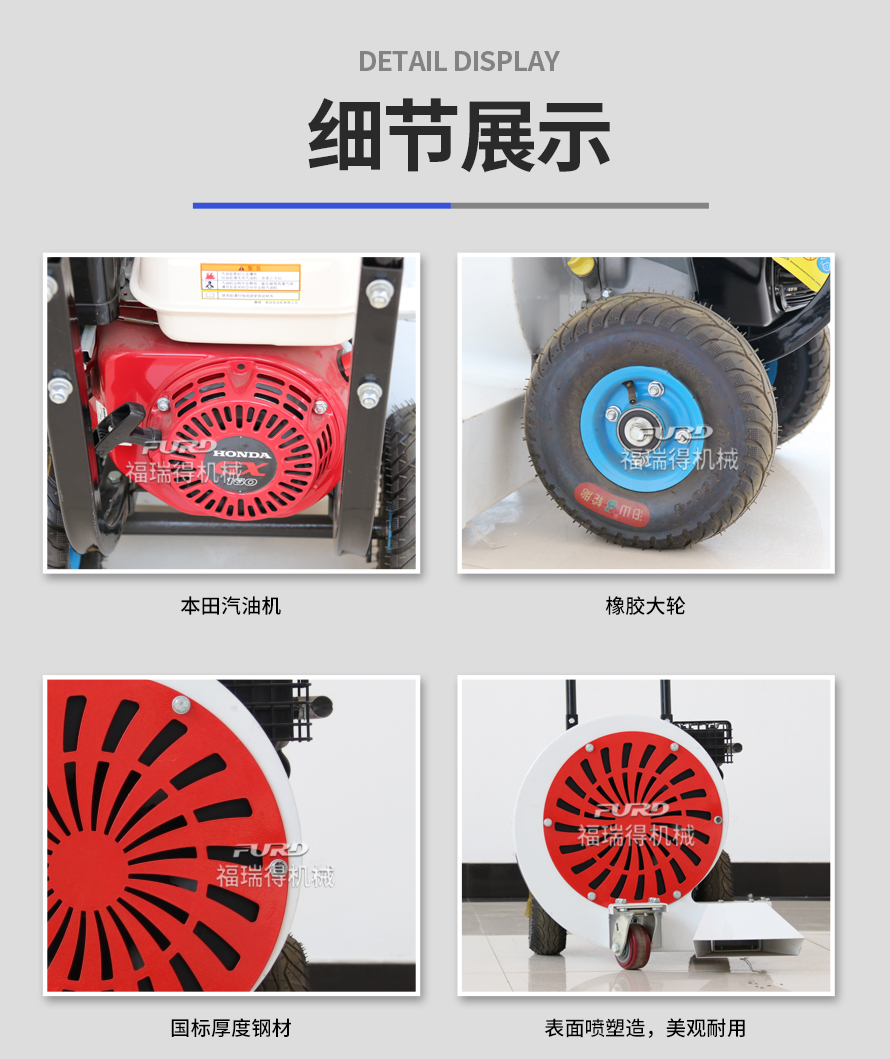 用于水泥、瀝青路面的清掃、清潔。 1.本田汽油動力,性能�(w�n)定; 2.動力平衡極好的�L(f�ng)�~,保�C整�w的�(w�n)定性; 3.超大�L(f�ng)量,性能優(yōu)越。