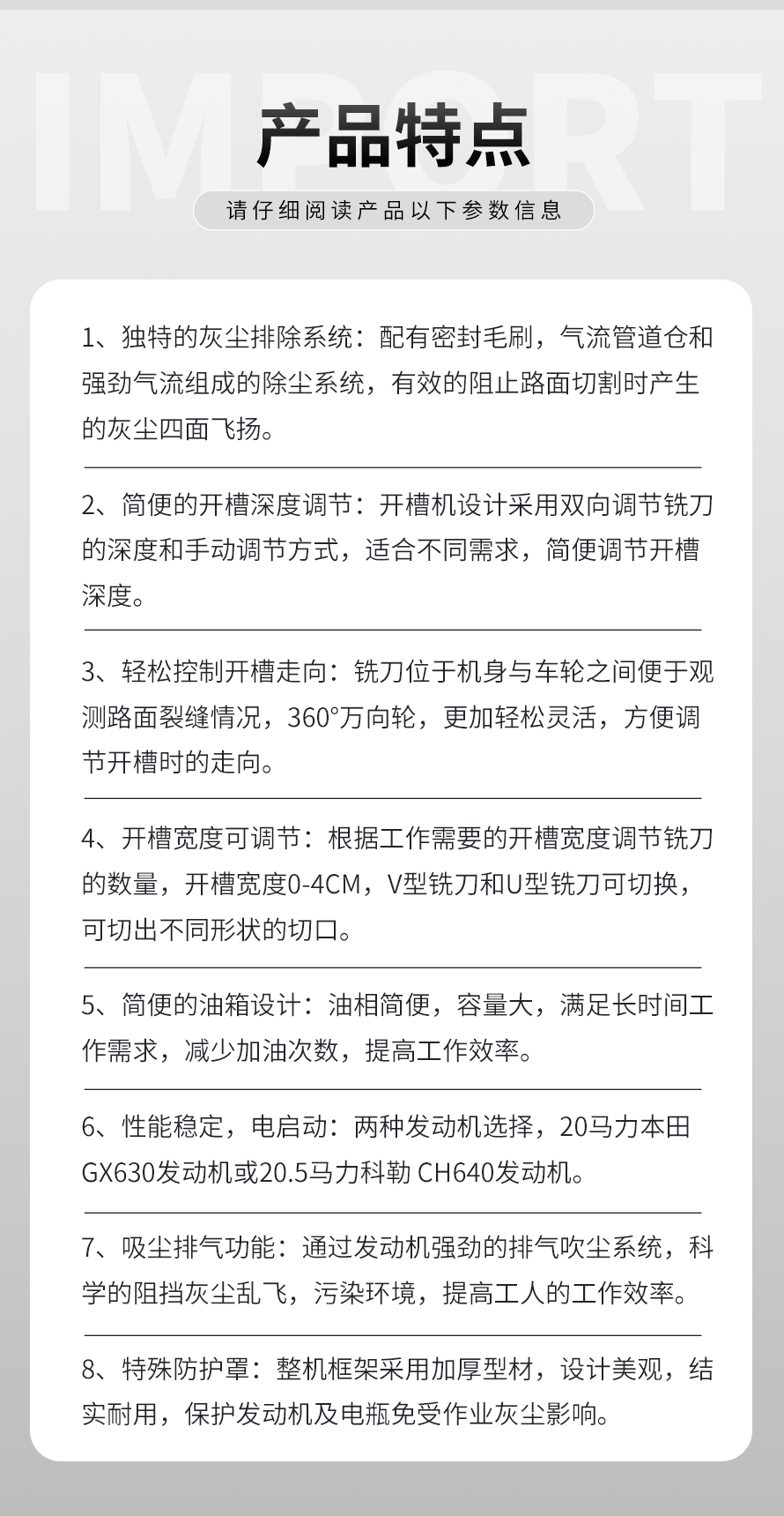 適用于瀝青路面灌縫修補(bǔ)前的裂縫打?qū)挕T撛O(shè)備具有使用方便,擴(kuò)縫速度快,刀片使用壽命長,擴(kuò)縫寬度可調(diào)等優(yōu)點(diǎn)