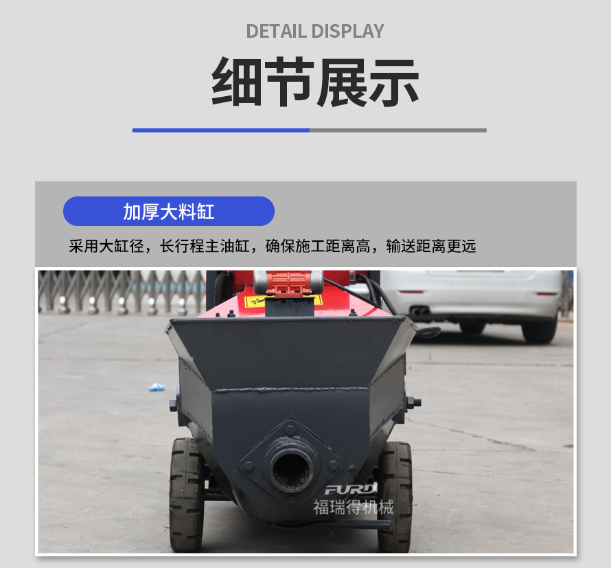 福瑞得二次結(jié)構(g�u)澆筑泵�m用于�品房、�r(nóng)村建房,打二次構(g�u)造柱,圈梁等,是您澆筑的好�O(shè)備。�機(jī)功率小,�w積小,重量�p,料斗可�降,真正能提高您的施工效率,是人工澆筑的幾十倍。
