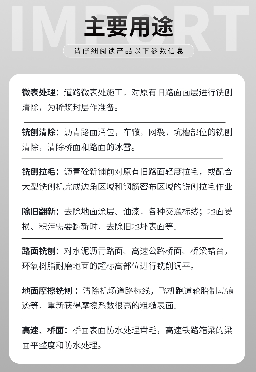 用于橋面��O(shè)瀝青或��g舊的混凝土地面重新攤�混凝土之前,清除水泥浮�{以及�P平拉毛, 也用于清除建筑施工中的堅硬灰渣。