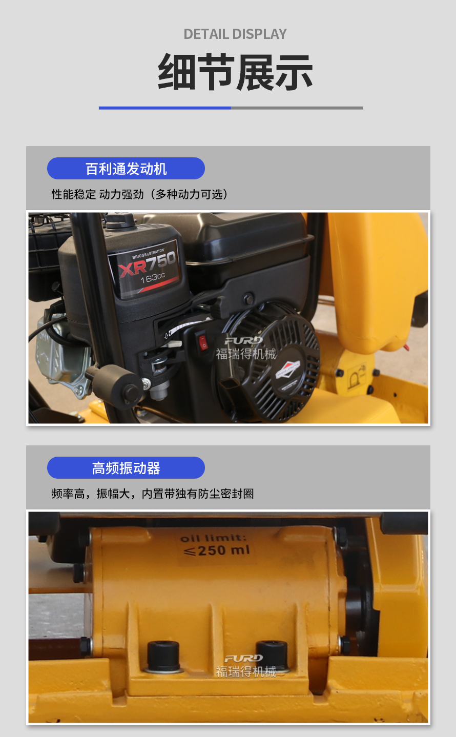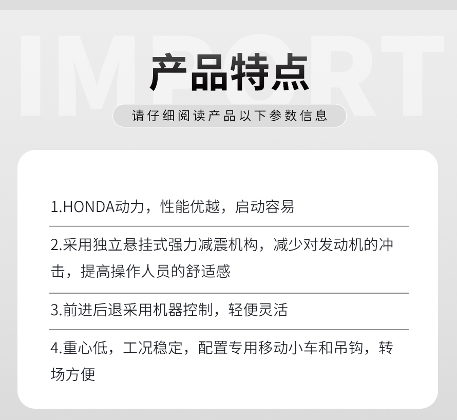 �m用于路基�緣、橋涵、管道、溝槽底部等狹�L地帶的壓實。 本田汽油動力,名牌品�|保�C。